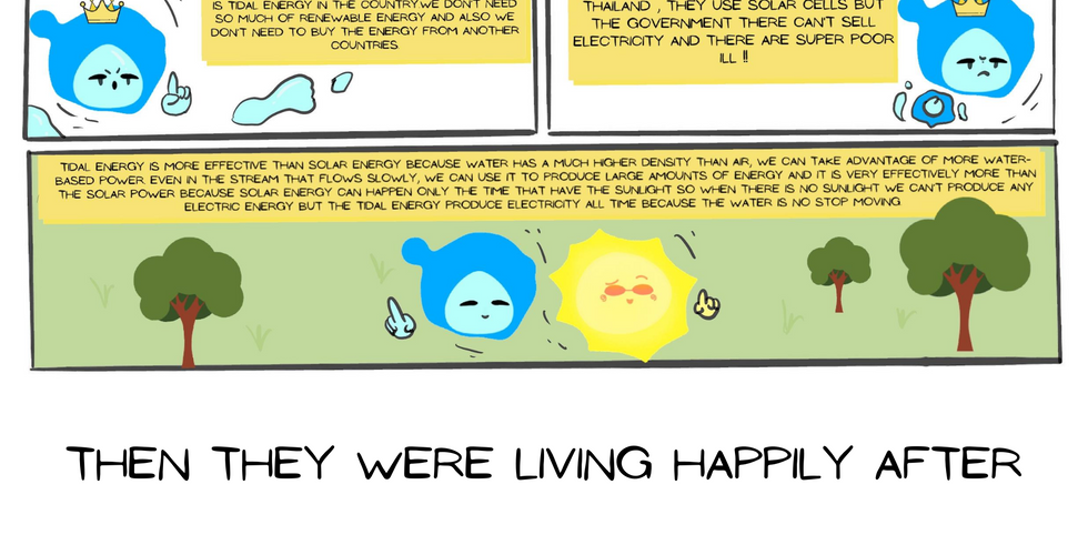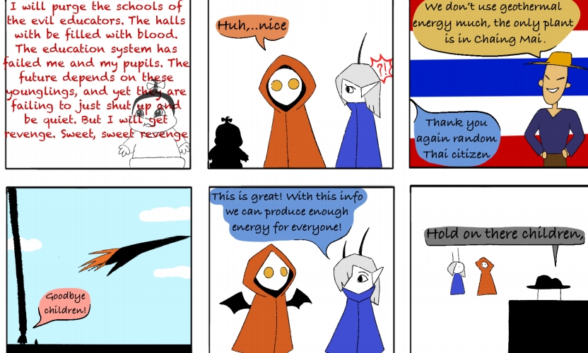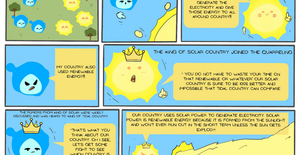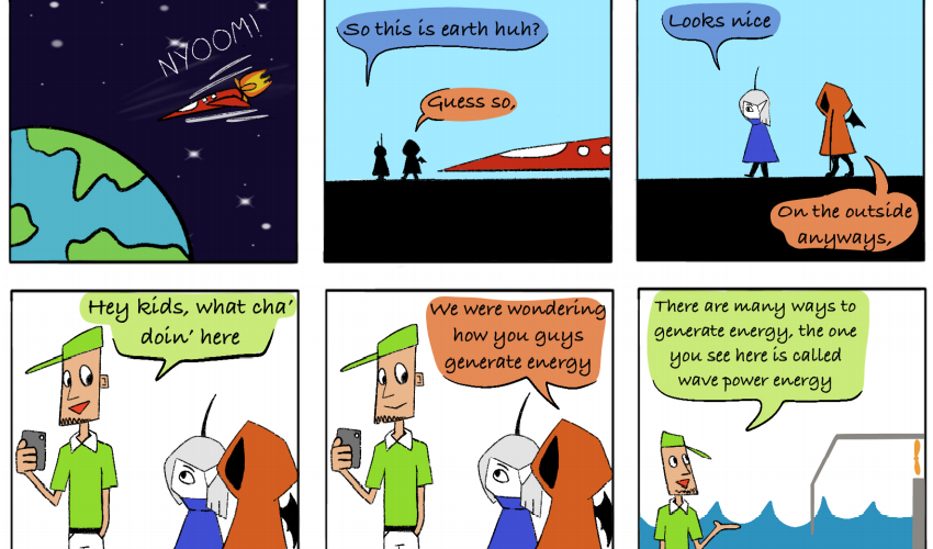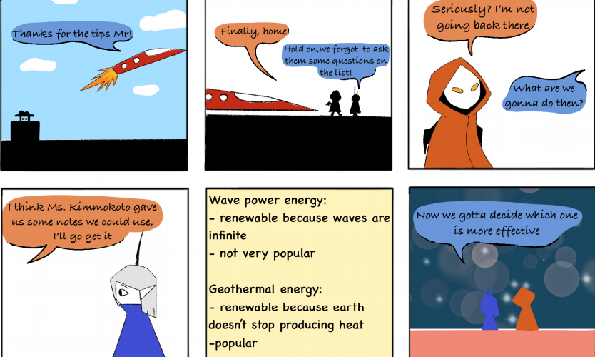 Students were divided into groups and each group was randomly given two different renewable energy sources to compare and contrast: hydro-electric, wind, geothermal, wave, tidal, and solar power. After been given a set of criteria and resources with what they needed to cover within their comic, it was up to them to come up with the narrative.